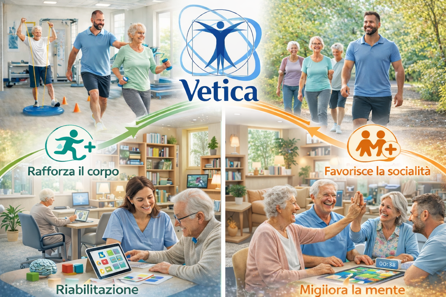 Attraverso lo sport, l'ASD Vetica porta avanti due impegni: accompagnare in parallelo il percorso riabilitativo e contrastare i segni del tempo sull'organismo. Per questo, sviluppa programmi di allenamento personalizzati, finalizzati al recupero dell'elasticità muscolare, della forza, dell'equilibrio e del ringiovanimento cellulare.